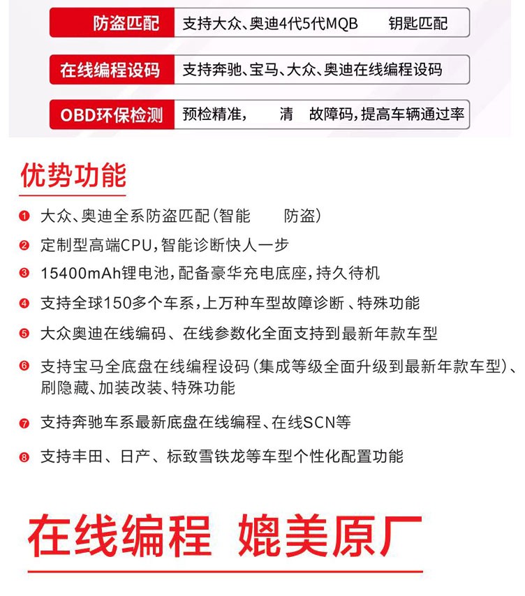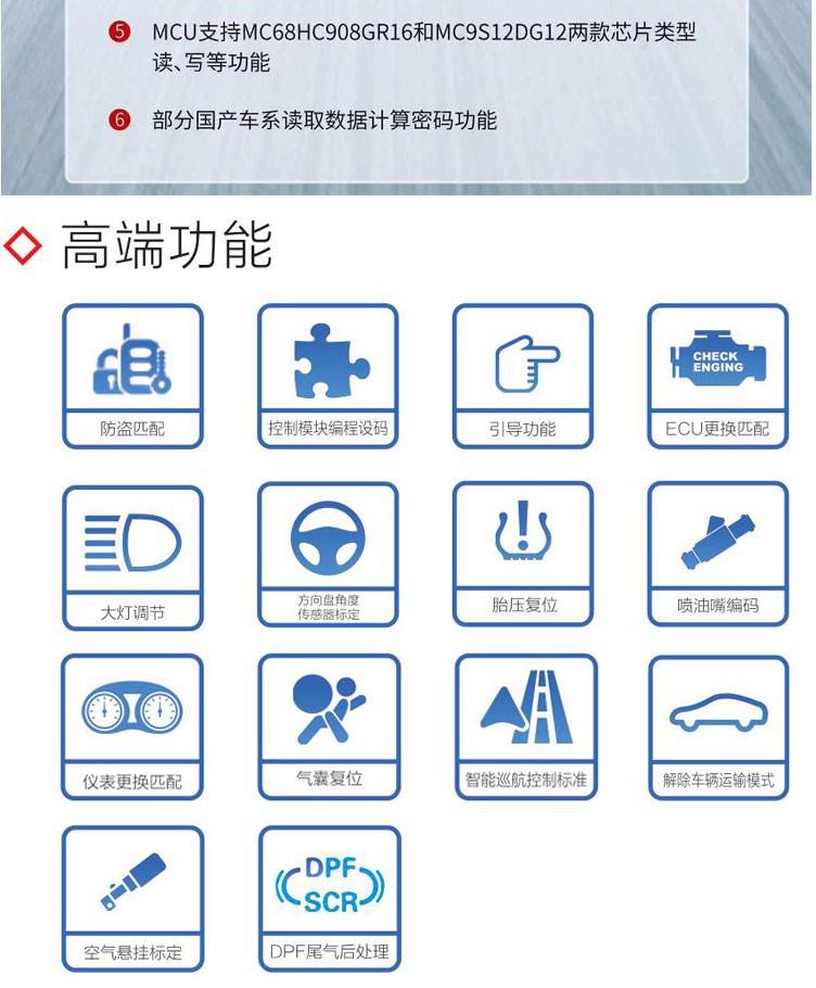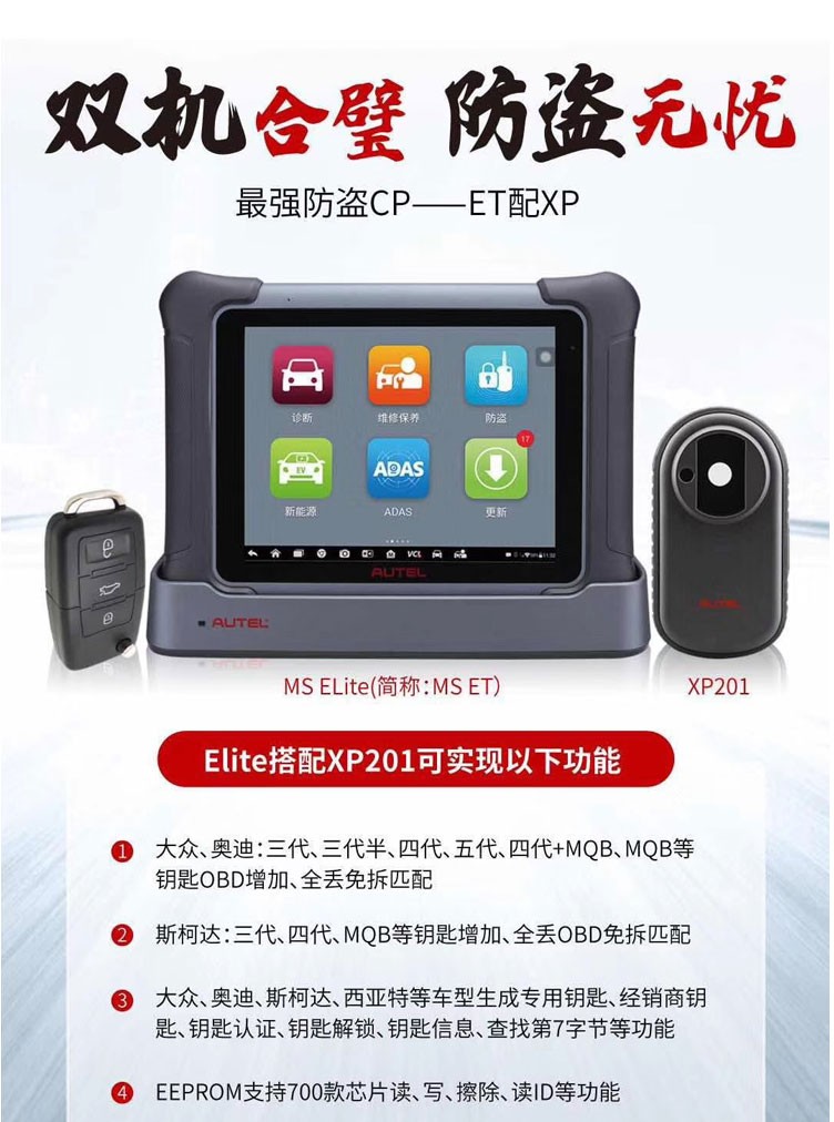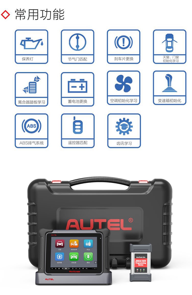 MaxiSys EliteMaxiSys®Elite汽車(chē)智能診斷系統是專業汽車(chē)診斷的新一代智能解決方案。采用NVIDIA的Tegra®4-PLUS-1四核1.8GHz處理(lǐ)器(qì),配備9.7英寸超靈敏電(diàn)容式視(shì)網膜屏,基于全新的Android多(duō)任務操作(zuò)系統,結合了最全的原廠級診斷車(chē)型覆蓋,從全面的車(chē)輛(liàng)診斷和(hé)分析到高(gāo)級ECU編程,MaxiSys Elite為(wèi)您提供方便、快速、高(gāo)效的汽車(chē)診斷解決方案。優勢功能1. 覆蓋MS908SPRO所有(yǒu)功能,新增大(dà)衆、奧迪全系防盜匹配 2. 定制(zhì)型高(gāo)端CPU,···